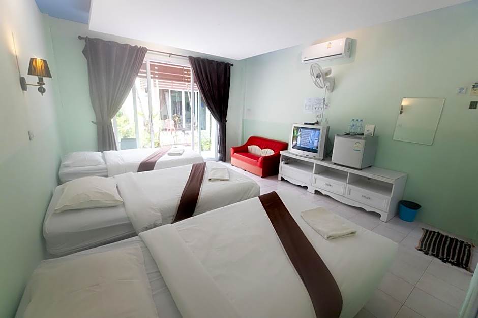 The quadruple room offers air conditioning, a seating area, a balcony with garden views as well as a private bathroom boasting a shower. The unit has 3 beds.